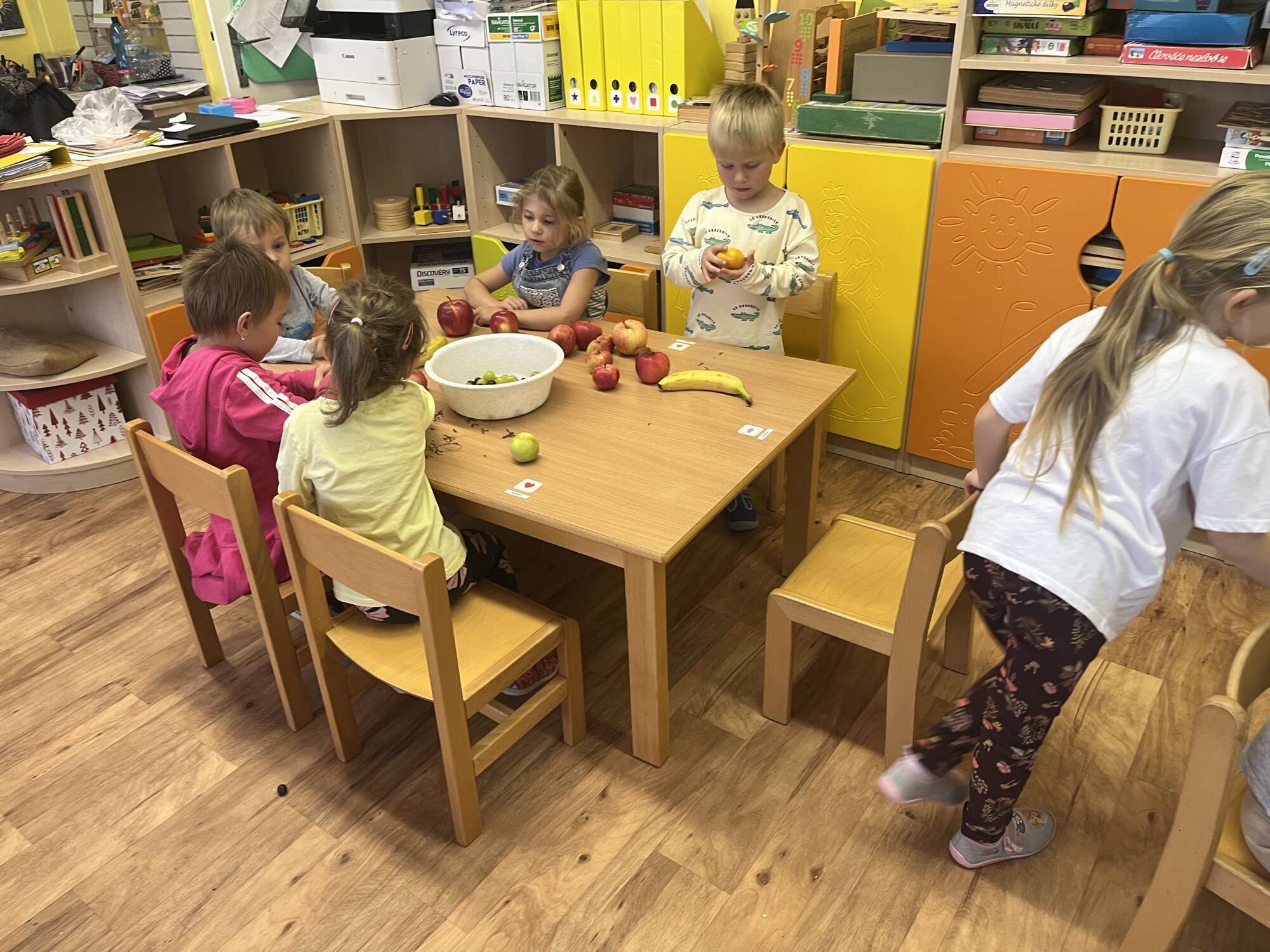 Společně si připravily ovocný a zeleninový salát, při kterém si zopakovaly názvy jednotlivých druhů ovoce a zeleniny. Na hotovém salátu si pak všichni moc pochutnali.