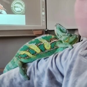 Součástí výkladu s audiovizuálními prvky byly opět ukázky živých exemplářů z různých taxonomických skupin. Tentokrát nás doprovázela zvířata spoléhající na svá krycí zbarvení (gekon létavý), somatolýzu (nebojte, dozvíte se co to je – krajta tmavá), schopnost barvy měnit (chameleon jemenský) nebo nápodobu částí rostlin (pablatnice nosatá, lupenitka velká).